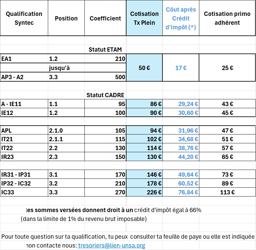 dans tous les cas ton paiement sera soumis à validation et remboursé si pas conforme, n'hésite pas à nous contacter si doute sur le montant: tresoriers@lien-unsa.org